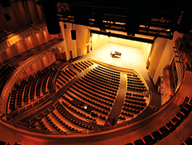 The theater was designed as a Gallery configuration with 2 Gallery levels. The Galleries are shallow, and wrap around in a crescent form, thus providing the audience with optimal proximity to the stage. This allows even the back row of ground floor seating to be within 100 feet of center stage, and enhances the acoustical performance of even the unplugged presentation of student voices. Ground floor seating for 800 persons is formed by curved elevated tiers with open railings; the 2 upper galleries each seat 200, but are only 4 rows deep. Ground floor side-aisles provide direct level access to stage.